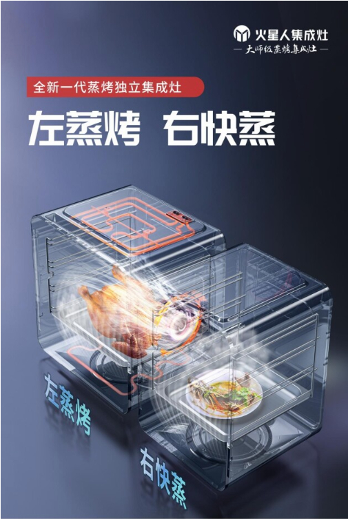2022年5月31日,火星人重磅发布全新一代蒸烤独立集成灶。打破传统蒸烤独立集成灶的限制,火星人以“左蒸烤+右快蒸”的双腔同蒸全新体验,实现集成灶蒸烤功能的跃迁。更为成熟的产品,更加科学的烹饪方案,火星人集成灶以创新者之姿,正式布局蒸烤独立细分赛道。