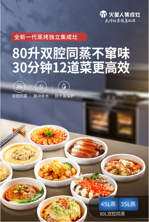 然而,蒸与烤两种不同的烹饪方式,对于国内市场的消费者来说同样有着不同的吸引力。相比烤制食品,蒸菜作为中式烹饪中最能保留食材原汁原味的方式之一,一直以来更受国人喜爱。在此背景下,火星人抓住机遇,研发出了全新一代蒸烤独立集成灶。进一步升级了集成灶蒸烤功能,火星人以“蒸烤(炸)一体机+便捷速蒸箱+蒸烤盘存放盒”的结构创新,三大功能集成实现空间的最优化利用。