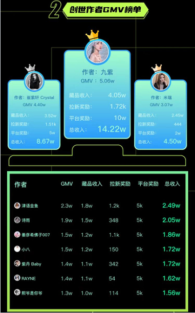 2022年5月18日,国内首个数字藏品社交平台Moment(www.moment.store)举办的创世活动圆满落下帷幕。在为期一个月的活动中,九紫获得创作者GMV榜冠军及14.22万元月收入,崔紫轩Crystal获得GMV榜亚军及8.67万元月收入,米瑞获得GMV榜季军以及4.5万元的月收入,津语金鱼等6名创作者则分获第4-10名。