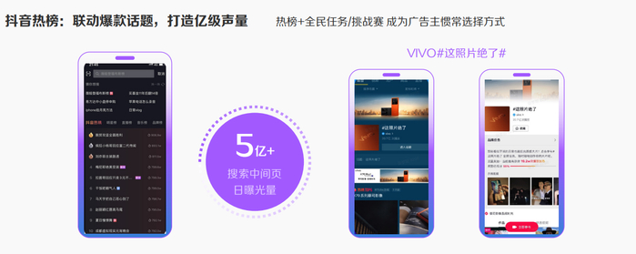 例如,去年在许多手机发布新机的时刻,vivo选择了以全民任务挑战赛的方式在抖音为新品造势,同步配上抖音热榜的卡位强力引流,为UGC内容持续注入活力,助力品牌和产品火热出圈。