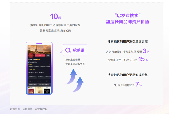 巴黎欧莱雅就是在投放了搜索广告后,发现搜索触达消费的用户拥有更高的消费意愿。 这正是由于用户在主动进行搜索时,就已经带着对品牌的潜在认知和了解。以声量颇大的巴黎欧莱雅安瓶面膜为例,用户在搜索产品前可能正处于对比和纠结阶段,需要搜寻更多信息帮助自己做购买决策。此时商家若能做好品牌展现和良好的信息传递,就能更好地助推用户从潜在受众变为忠实消费者。在搜索广告与电商配合后,该渠道人均客单量是其他渠道的3倍;而从“启发式搜索”中转化的用户GMV占比也达到了15%。
