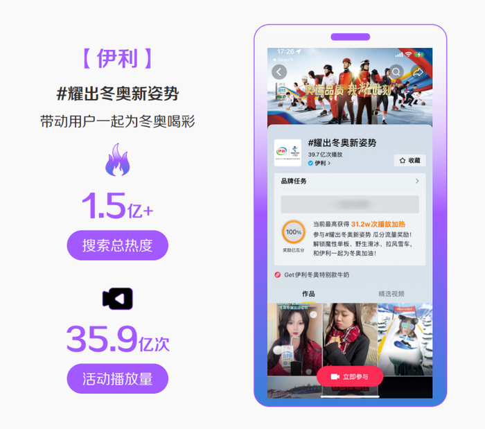 在冬奥会期间,伊利用#耀出冬奥新姿势为话题发起全民任务,激发用户们参与了魔性单板、野生滑冰、拉风雪车等各种挑战。同时进行了“抖音热榜+热点品专”的搜索广告资源组合投放,成功拉来亿万网友一起为冬奥和中国队喝彩。