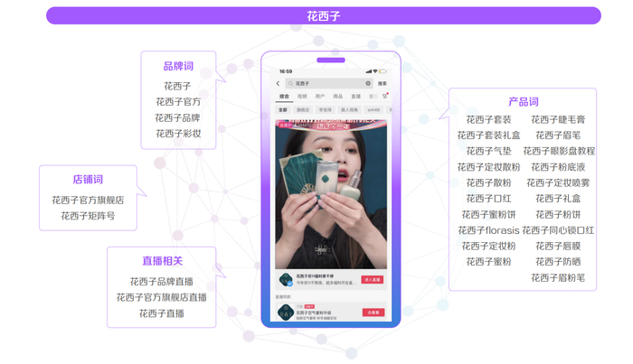 花西子就通过搜索品专的方式,承接住了用户被种草视频激发出的搜索兴趣。而且在流量获取时,还借助巨量引擎丰富的拓词工具,以更精准的搜索关键词覆盖了品牌、多样化的产品线、店铺及直播等多种场景信息触点,让用户一搜即可进入置顶在搜索页面中的直播品专,获取到了更多的高意向流量。在这种打法加持下,去年双11期间花西子GMV大幅增长,直播品专CTR高出大盘8%。