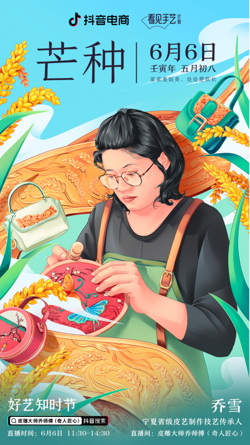 6月6日是二十四节气中的“芒种”。在传统习俗里,这一天是北方收小麦和南方种水稻的日子,既要播种,也有收获。这一天,乔雪也走进了抖音电商直播间,跟人们分享自己和手工皮艺不离不弃的故事,让更多人看见传统艺术的魅力,爱上手工包,进而将非遗皮艺传承的种子在更多人心中种下。