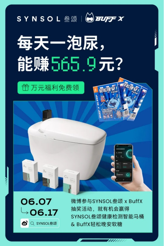 伴随合作上线,为了吸引更多人了解尿液观测健康的价值、体验“技术流养生”的特别之处,BuffX与叁颂还在微博联合发起了话题性十足的“每天一泡尿,能赚565.9元”活动,幸运用户不但可以免费获得一套尿检马桶和功能软糖,还将在接下来30天的使用中,花式分享自己的马桶软糖故事。