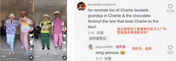 其中一段视频里,父子俩身着粉嫩的潮服,头顶贝雷帽,伴着嘻哈舞随性扭摆。网友评论道,布莱恩像极了电影《查理和巧克力工厂》中陪小查理一起冒险的约瑟夫爷爷,7000多人点赞认同。