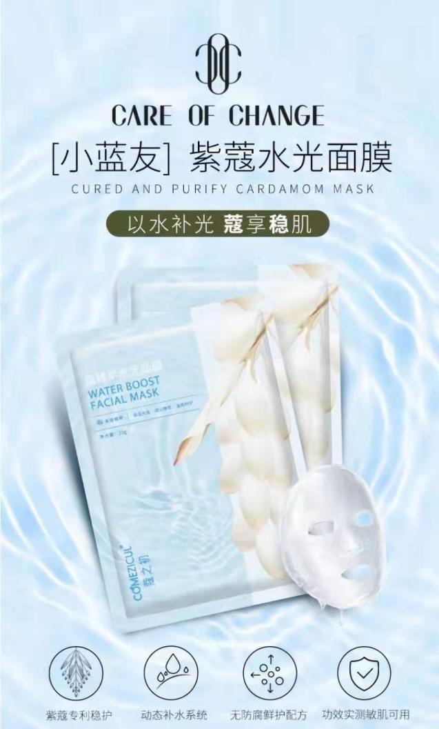 第一项:「小蓝友」稳愈力。 小蓝友豆蔻水光面膜拥有高渗透稳愈力,成分添加了豆蔻臻萃专利,协同多重植萃,能够更好的由内而外修护肌肤屏障,打好补水基础。
