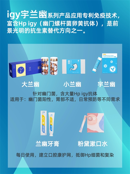 宇诚健康历时12年专注于幽门螺杆菌生物抗体的研究,携手免疫学领域的顶尖学者与三甲医院消化科的专家在幽门螺杆菌免疫学研究领域获得重大突破,研发出具备实际应用价值的幽门螺杆菌特异性生物抗体—Hp igy(幽门螺杆菌卵黄抗体),并在Hp igy针对幽门螺杆菌的实际应用中取得多项国家专利。先后推出了以Hp igy为核心成分的igy宇兰幽系列多款产品:兰幽牙膏,粉黛漱口水,兰幽咀嚼片,宇兰幽冲剂,从口到胃,解决幽门螺杆菌带来的各种问题。很多用过三联疗法/四联疗法根除失败的患者,再次根除时不吃抗生素而是采用Hp igy抗体疗法取得了转阴的结果,并且胃部的不适也有明显改善。系列产品也帮助一些体质特殊的人群(如老人、儿童等)解决不能吃三联药物/四联药物或对抗生素过敏但又必须清除幽门螺杆菌的困扰。