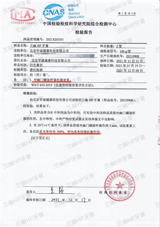 经第三方权威检测机构检测证实,igy宇兰幽系列的产品对于幽门螺杆菌有较强的抗菌作用,灭菌率>99.99%。