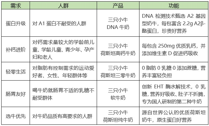 作为“功能牛奶新标杆”,三只小牛深耕“功能”已久,面向乳糖不耐受人群的软牛奶,面向睡眠障碍人群的睡前30分牛奶,面向健身控体人群的三零牛奶,产品功能推陈出新、领跑品类,旨在让每个国人喝得科学、喝得健康。