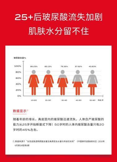 各类数据证明随着年龄的增长,真皮层内的玻尿酸迅速流失。人体自产玻尿酸的能力从25岁开始断崖式下降!50岁时的人体内玻尿酸含量只有20岁时的45%左右。