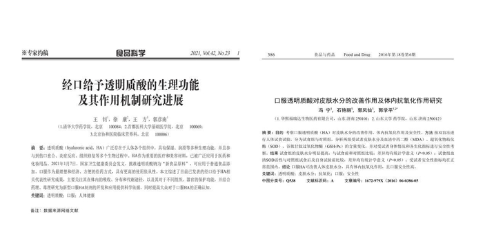 早在2016年由华熙福瑞达生物医药有限公司和山东大学药学院等作者发表在《食品与药品》期刊(2016年第 18卷第6期)上的《口服透明质酸对皮肤水分的改善作用及体内抗氧化作用研究》和由清华大学药学院,联合首都医科大学基础医学院、北京协和医院临床营养科等作者共同发表在《食品科学》期刊(2021年42卷23期)上的《经口给予透明质酸的生理功能及其作用机制研究进展》的研究成果,证实口服玻尿酸对人体皮肤、眼部、关节,有一定保护功效。