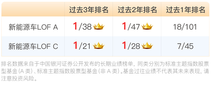 据银河证券数据,截至2022年6月3日,新能源车LOF无论是A份额、还是C份额,过去3年、过去2年在同类基金中均排名第一!