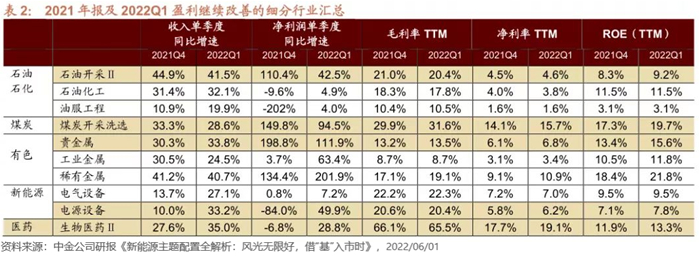 中金公司在上述研报中也指出,尽管2021年下半年以来A股整体盈利进入下行通道,但依然有部分行业延续了较高的盈利增速,这些行业主要集中在部分上游资源品、新能源产业链和医药领域。
