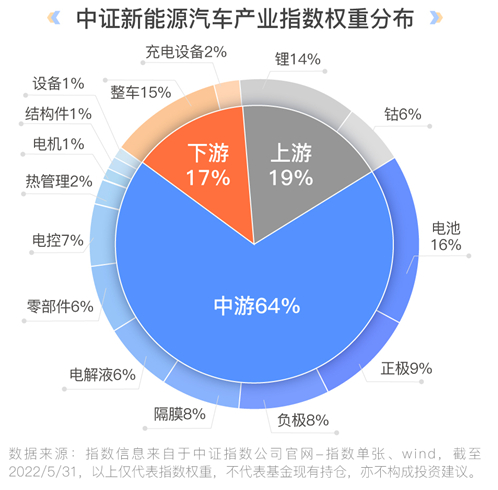 值得关注的是,新能源车LOF所跟踪的中证新能源全车产业指数(930997.CSI),是由基金公司(汇添富)向指数公司定制的新能源汽车指数。指数覆盖了新能源产业链的上中下游,同时又重点突出,充分体现了上游反映资源禀赋、中游反映技术进步、下游反映消费需求的产业链投资逻辑。