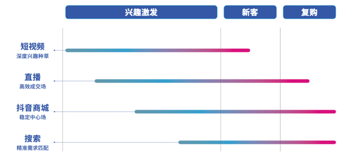 抖音电商平台上其实有四个主力消费场域——短视频、直播;抖音商城、搜索。