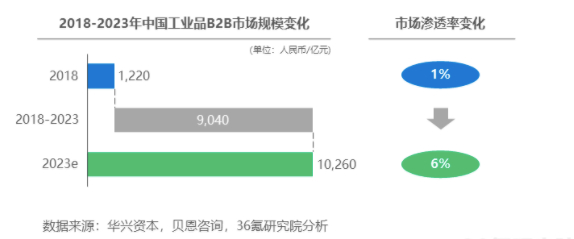 根据数据统计,一般来看,工业用品的需求占企业产值的5%-10%。 这种刚需投入对应的是广袤的市场蓝海。根据36氪研究院发布的《2020年中国工业品B2B行业研究报告》显示,2018年我国工业品市场规模达12.2万亿元, 过去十年年复合增长率9%,其中工业品B2B市场规模约为1220亿元,线上渗透率约为1%,预计到2023年市场规模将达万亿元。