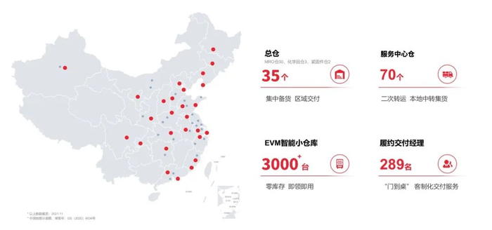 这种交付体系在被不断填充到中国的地域拼图里。在过去的8年时间里,震坤行已建成35个全国总仓,70个服务中心仓,3000+EVM智能小仓库,履约交付经理人数接近300人,着力搭建覆盖全国“最后一公里”的交付网络。