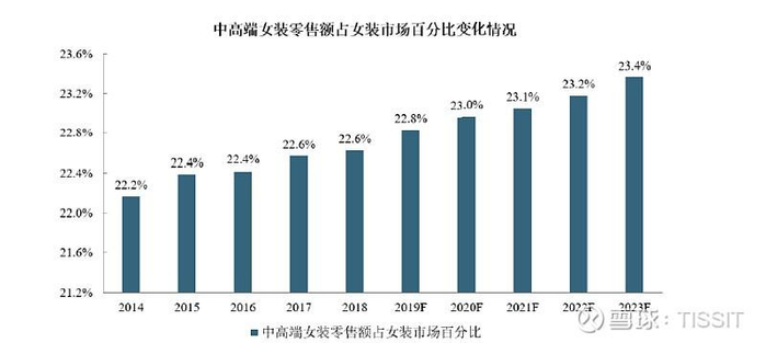 根据Euromonitor研究报告,最近五年我国中高端女装零售额占女装市场的比例呈稳步上升趋势,同时Euromonitor预计未来5年,中高端女装零售额占女装市场的比例将会有更快速地提升,从2018年的22.6%提升至2023年的23.4%。