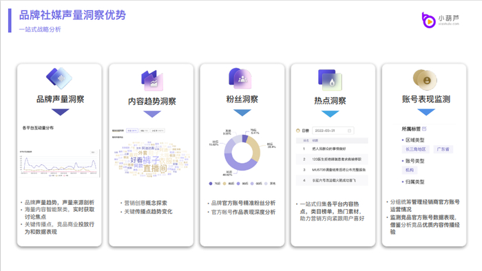 小葫芦SaaS洞察云系统,共有5大功能模块,分别是品牌声量洞察、内容趋势洞察、粉丝洞察、热点洞察、账号表现监测。