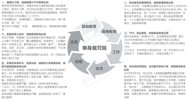 从小孩到成年到工作到生活,再到结婚生子,多数因素都在直接或间接推动单身现象,且呈现恶性循环之势,我们将其概括为“单身魔咒链”;