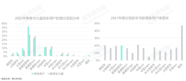虽然紧凑型轿车市场断崖式下滑,但易车研究院调研发现,单身用户仍对紧凑型轿车情有独钟,2021年占比高达36.10%。同时,单身用户在紧凑型轿车的渗透率接近20%,除了跑车,并不亚于其它主流细分车市,但跑车销量太少,可以忽略不计;