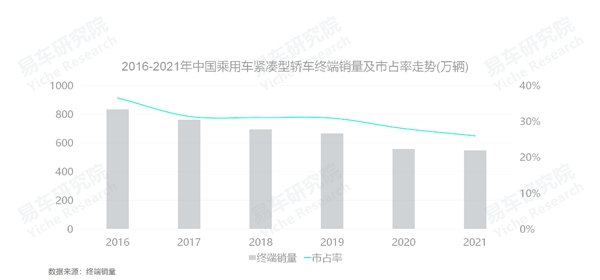 2016-2021年,中国乘用车市场的紧凑型轿车的终端销量,由832万辆持续大幅下滑至548万辆,足足少了近300万辆,掉了近35%,差不多一个德国车市的年销量没了(2021年德国汽车销售262万辆)。期间凡是以紧凑型轿车销量为主的车企,没有一家的日子是好过的;
