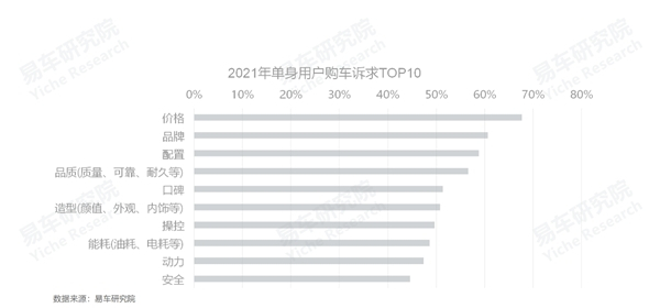 集中大城、聚焦青年白领、主打运动兼顾时尚、主打入门兼顾高端等,意味着在具体的市场层面,车企的年轻化战略不应再高举价格战了。易车研究院调研发现,虽然受制于收入水平,价格是单身购车用户最看重的,位居2021年单身用户购车诉求的榜首,但优势不是特别突出,单身用户还注重品牌、配置、品质、口碑等。相对综合的诉求,助推车企年轻化战略的市场策略,由价格战转向产品与价值战;