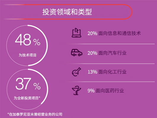 2021年,外商对加泰罗尼亚的投资多集中于工业领域。相较其他产业经济,工业经济更加开放、更具创新性和生产力,并能够带动更加稳定、高质量的就业。正是这些特点使其成为商务和劳工部重振加泰罗尼亚工业计划的重中之重。据统计,2021年,在由加泰罗尼亚贸易投资局管理的外商投资中,投向工业的资金共计4.06亿欧元,占总投资的66%。也就是说,外商投资的每3欧元中就有2欧元投向工业。 在2021年落地加泰罗尼亚的82个外商投资项目中,37%为全新投资项目,由此前从未在加泰罗尼亚开设过业务的企业投资;44%的项目则是由已经在该地区开展过业务的公司投资,这些企业或在当地进行了规模扩张或开展了新的投资项目。