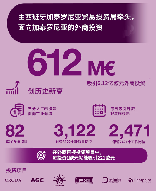 2021年,西班牙加泰罗尼亚贸易投资局为当地共吸引外商投资6.12亿欧元,较去年增长28%,创造了自1985年以来的最高纪录。
