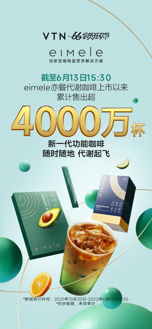 6月13日,在VTN 66会员狂欢节中,eimele亦餐表现不俗——开售35分钟,eimele 亦餐代谢咖啡售出80000盒。