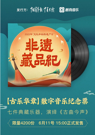 2022年“文化和自然遗产日”来临之际,由国家文旅部主办、中国演出行业协会承办的“云游非遗·影像展”活动上线。酷狗音乐携手中国青年报·中青在线发起《非遗·藏品纪》主题活动,邀请青年歌手创作推出融合非遗元素的原创音乐《古曲今声》,并以非遗乐器为主题发行首个“古乐华章”数字音乐纪念票藏品,让古老非遗与时代发展紧密贴合,让非遗的传播方式更加亲切生动。