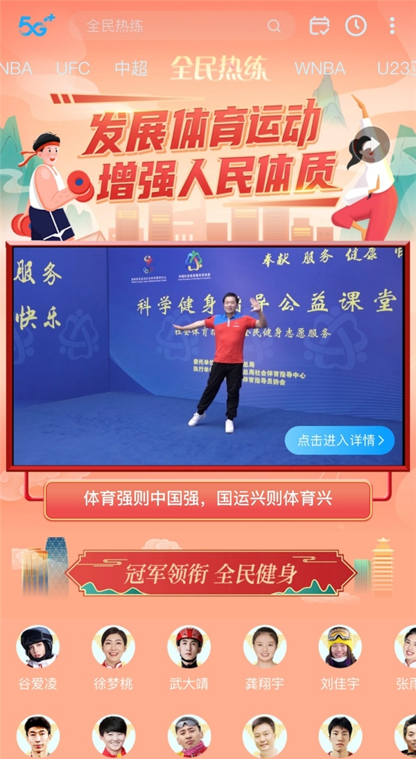 国家体育总局、全国31省和自治区体育局、中国棋牌协会和中国武术协会、中国移动、奥运冠军丁宁、徐梦桃、任子威,以及主流媒体记者代表齐聚云端,为全民健身推广助力,共同发布5G全民健身频道,上线“全民热练”健身内容专区。