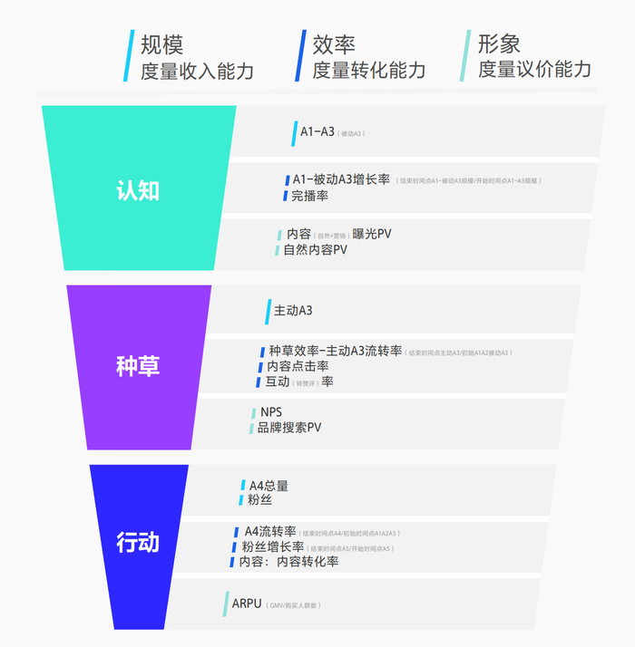 经过长期对品牌广告的度量探索,巨量云图推出的SCI品牌力模型,能够从规模、效率、形象三个维度评估品牌投放的综合表现,具体来看,SCI可以通过曝光、A1-A3人群数、主动A3流转效率等指标,度量认知人群规模、种草效率、品牌形象的变化。
