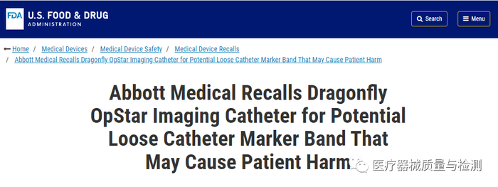 2022年5月26日,美国食品药品监督管理局FDA官网发布,雅培召回Dragonfly OpStar Imaging Catheter(蜻蜓OpStar成像导管),召回数量达4800根,FDA 已将此确定为 I 类召回。