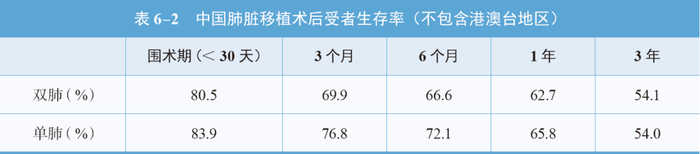 国家肺移植质控中心主任陈静瑜教授介绍,我国双肺移植受者术后围术期(<30天)、3个月、6个月、1年及3年生存率分别为80.5%、69.9%、66.6%、62.7% 和54.1%。我国肺移植生存率方面距离国际水平还有差距,主要原因是供体呼吸机使用时间长、受体年龄偏大等。2020年,我国还进行了新冠患者肺移植手术,作了有益探索,提供了中国经验。
