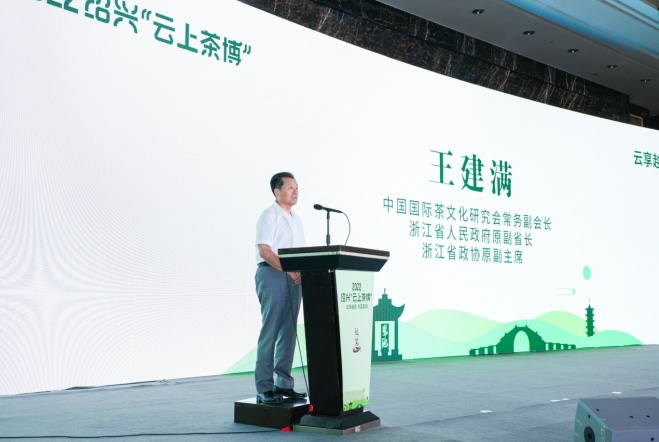 云享越茶,共富茗城。中国国际茶文化研究会常务副会长、浙江省人民政府原副省长、浙江省政协原副主席 王建满宣布本次2022绍兴“云上茶博”正式开幕!