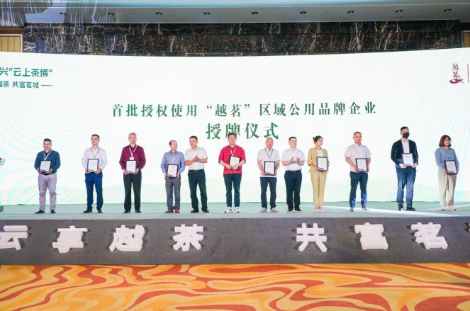 会上首批“越茗”区域公用品牌授权使用企业授牌仪式如期进行。绍兴市人大常委会副主任袁立江和绍兴市政协副主席陈德洪为首批授权使用“越茗”区域公用品牌的10家企业进行了授牌仪式。