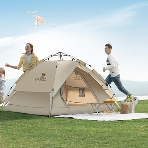 首先,骆驼为解决帐篷收放困难的痛点,这款第七代经典全自动帐篷采用耐用弹压式自动帐架,帐篷从地面展开再向下压即可自动撑开,全程只需要轻轻一提,就算是女生也能轻松完成,全程保证收纳过程的体验。尤其是针对独自出行的女性而言,这款10秒速开的帐篷绝对是露营神器。