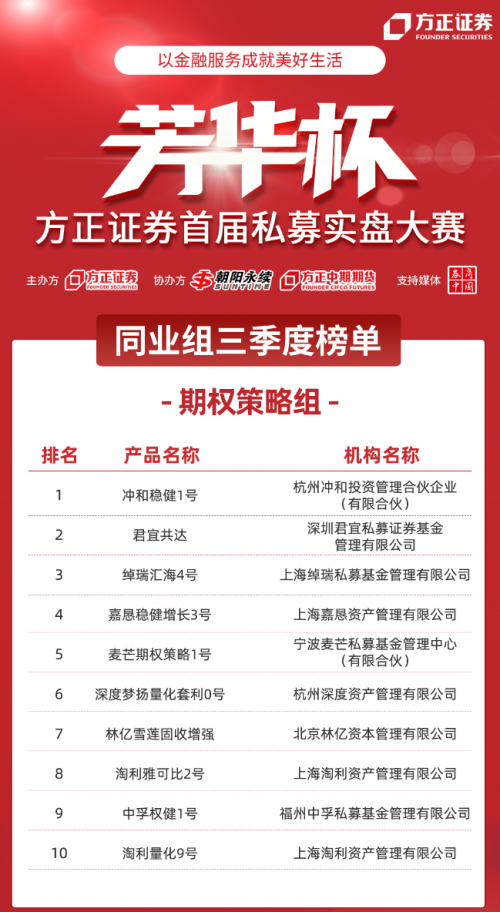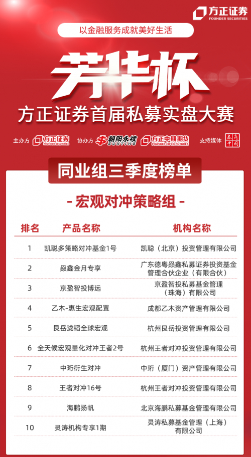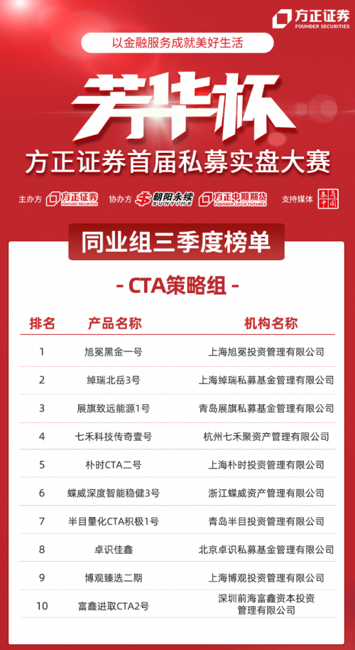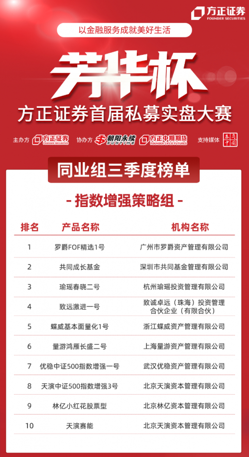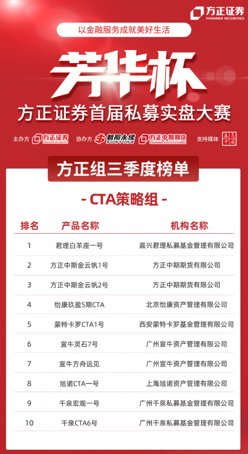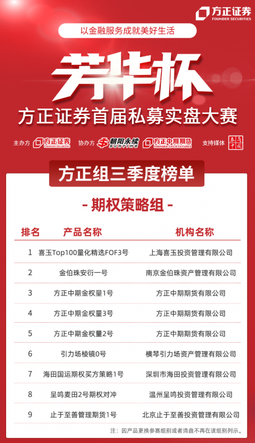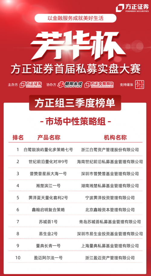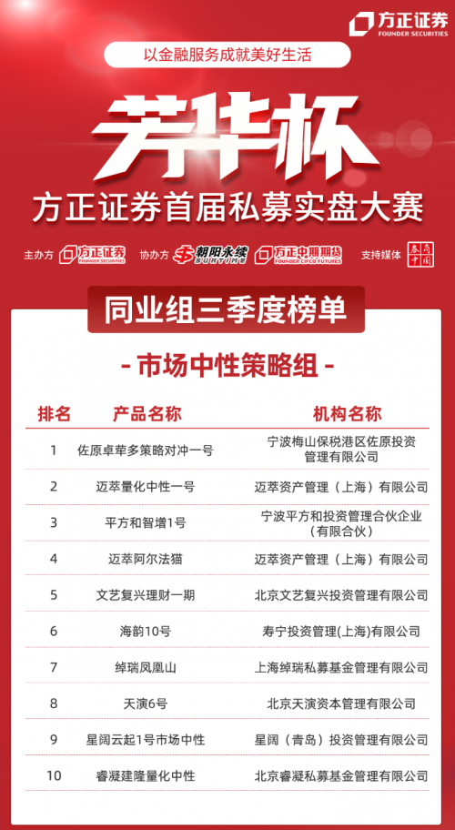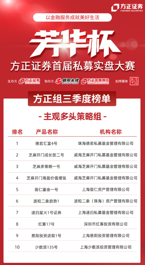 方正证券首届“芳华杯”私募实盘大赛三季度榜单公布