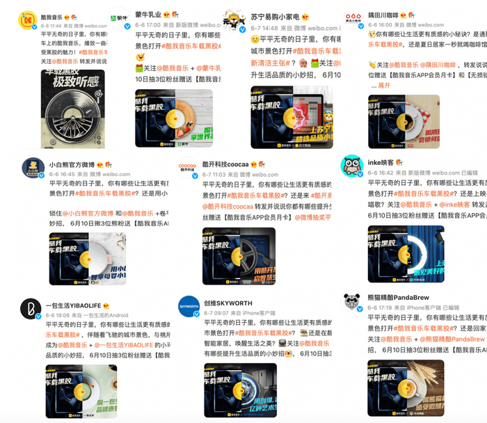 无论是开车时听一首黑胶好歌、还是清晨享受一杯醇香的咖啡、或是采购几件家用电器,都能满足内心的幸福感,让生活品质触手可及。“读书也能带来品质生活”、“买点鲜花、听听音乐,随时都能享受品质生活”,在酷我音乐和合作方官微的带动下,网友们纷纷转发微博,分享自己日常提升生活品质的“小绝招”,很快引发了话题的二次传播。