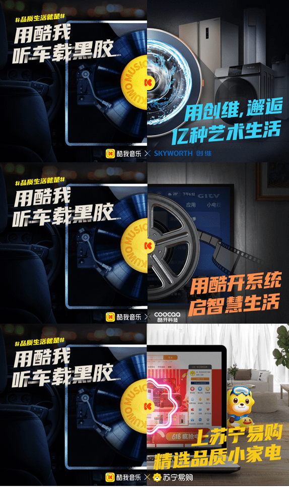 “品质追求”是酷我音乐和合作方们共同希望表达的品牌理念。此次联名品牌领域涉及饮品、家电、科技、社交媒体等,如何将看似与车载黑胶关联不大的产品元素自然融合并突出质感,是本次联名海报的最大亮点。