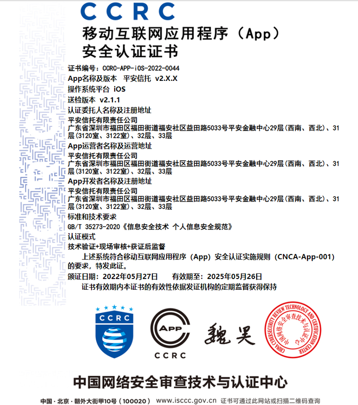 以平安信托App为例,公司在App安全合规、个人信息保护、数据安全、数据治理等领域重拳出击,积极践行SDLC软件安全开发生命周期全流程体系,从业务需求之始即强化客户个人信息管理,防止数据违规共享、滥用和泄露。日前,平安信托App顺利通过中国网络安全审查技术与认证中心(CCRC)的移动互联网应用程序(App)安全认证,成为国内信托业第一家获得该认证的App。家族信托方面,公司则率先在行业内进行智能化系统建设投入,确保信托财产管理过程中的数据防丢失和防篡改,降低人工操作风险。