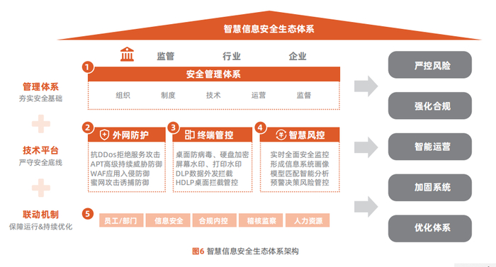 白皮书创新性地提出“组织、制度、技术、运营、监督” 信息安全管理体系建设方法论,即自上而下的组织体系、相辅相成的制度体系、纵深防御的技术体系、前置贯穿的运营体系、联防联控的监督体系,以此筑牢信息安全“压舱石”。同时,通过“整体规划,建立健全信息安全管控体系”、“夯实基础,重点聚焦隐私数据安全保障”、“智能运营,打造信息安全智能运营系统”、“共建共享,赋能行业安全生态体系建设”四大举措,致力于构建智慧信息安全生态体系。