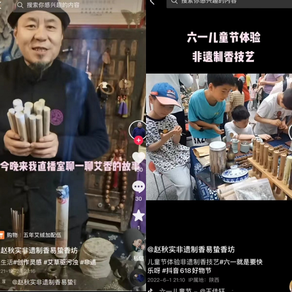 现如今,一些年轻人会千里迢迢从全国各地赶到陕西看赵秋实制香,更多的年轻人时常来到赵秋实的抖音小店定制香料,自用或包装成礼物送人。抖音商城、搜索等主动探索场景则成为这些对非遗手艺感兴趣的年轻人的承接转化场,简单方便地找到非遗小店,实现精准匹配和复购。