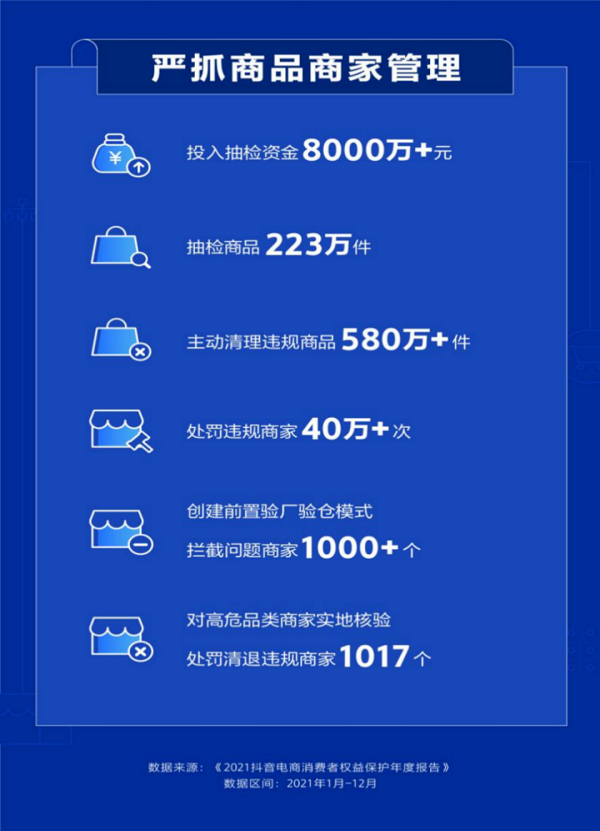抖音电商把维护良好的营商环境视为重中之重。《2021抖音电商消费者权益保护年度报告》显示,抖音电商全年拦截违规商品发布超9100万次,主动封禁违规商品超580万件,下架风险商品超320万件,处罚违规商家超40万次,清退严重违规商家超4万个。