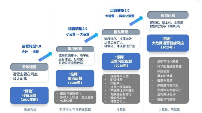 调研发现,一些金融机构主要应用方向仍局限于统计和监管报送,并未对运营模式创新产生根本性的变革。商业银行业运营管理领域在经历了“分散运营、集中运营、精益运营”阶段后,在数字化转型背景下,“精益运营”偏流程管理的解决方案已出现较大的技术瓶颈,海量数据算力不足导致不能深度挖掘、刻画风险行为,造成预警量大、误杀率高、核查压力大等问题。