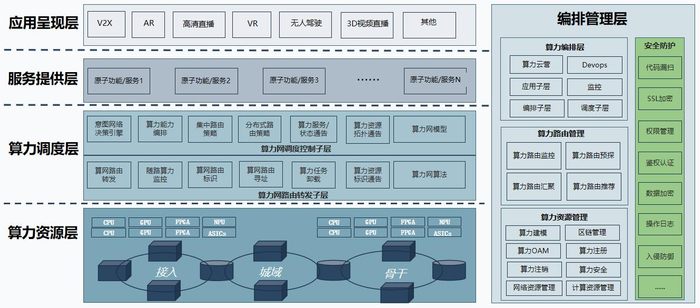 编排管理层:完成算力运营及算力服务编排(应用子层、编排子层、调度子层),采用Devops工具配合监控进行灰度迭代;完成对算力资源和网络资源的管理,包括对算力资源的感知、度量和 OAM管理等;实现对终端用户的算力网运营,以及对算力路由层和网络资源层的管理;完成整个算力网的安全防护,让算力网在可靠、可控、安全、适度的环境中稳定运行;
