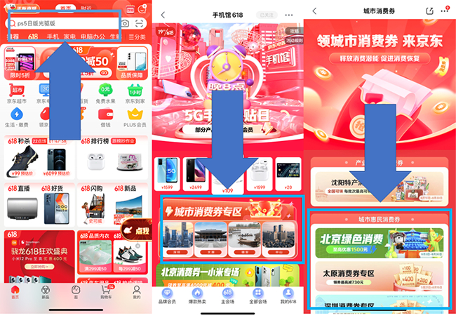 当前位置定位在在北京、太原、深圳、成都、郑州等地的用户,除了在京东App首页搜索“消费券”进入消费专区外,在京东App搜索“手机618”进入主会场,点击城市消费券专区,在打开页面中找到对应城市的消费券即可进入活动页面,接下来就一起来看看哪些产品能享受优惠吧。