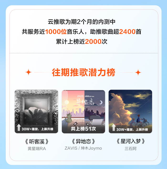 云推歌助力音乐人新歌冷启,加快优秀作品的流量分发。云推歌基于网易云音乐多年来在音乐推荐场景下的算法推荐技术积累,面向平台音乐人,提供付费流量增长服务。通过对歌曲的算法赋能,可以实现对推荐歌曲精准定向推荐,让动听的歌遇见喜欢的人,加快了优秀作品的流量分发,并且向音乐人提供一站式数据反馈,帮助音乐人更高效地推歌与创作。在为期两月的内测中,云推歌共计服务近千位音乐人,助推歌曲超2400首,相关歌曲累计上榜近2000次。